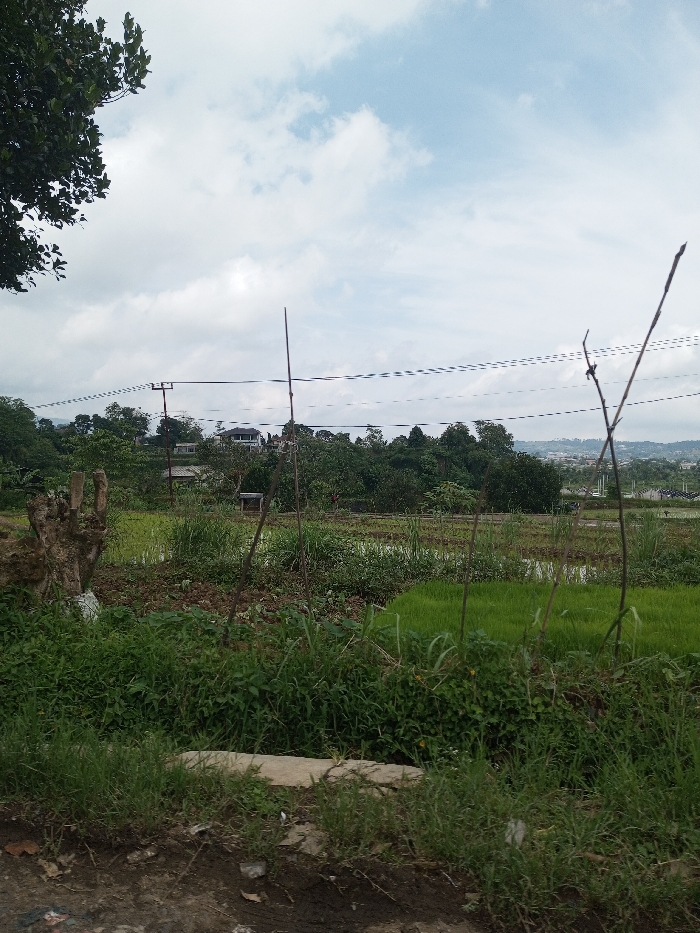 The scene depicts an agricultural landscape under a cloudy sky in Vieng Phouka, Laos. The immediate foreground consists of dark soil and dense green vegetation, with a flat, light-colored slab partially obscured beneath the foliage. The midground is characterized by multiple segmented rice paddies, some featuring vibrant green crops and others containing standing water reflecting the overcast sky. Several thin, dark-colored wooden or bamboo stakes are vertically inserted into the ground within these fields. To the left, a large, weathered tree stump with visible root systems is present. Beyond the paddies, a dense line of diverse green trees and bushes forms a natural barrier, with a small, dark, rectangular structure with a sloped roof partially visible among them. In the background, a utility pole supporting multiple horizontal power lines is positioned in the upper left. Scattered light-colored residential buildings with dark roofs are discernible on an elevated distant landmass, with a more expansive, faintly visible urbanized area extending towards the right horizon. The sky is largely covered by white and grey clouds, with a patch of lighter blue sky visible towards the top center. No individuals or animate subjects are visible in the frame.