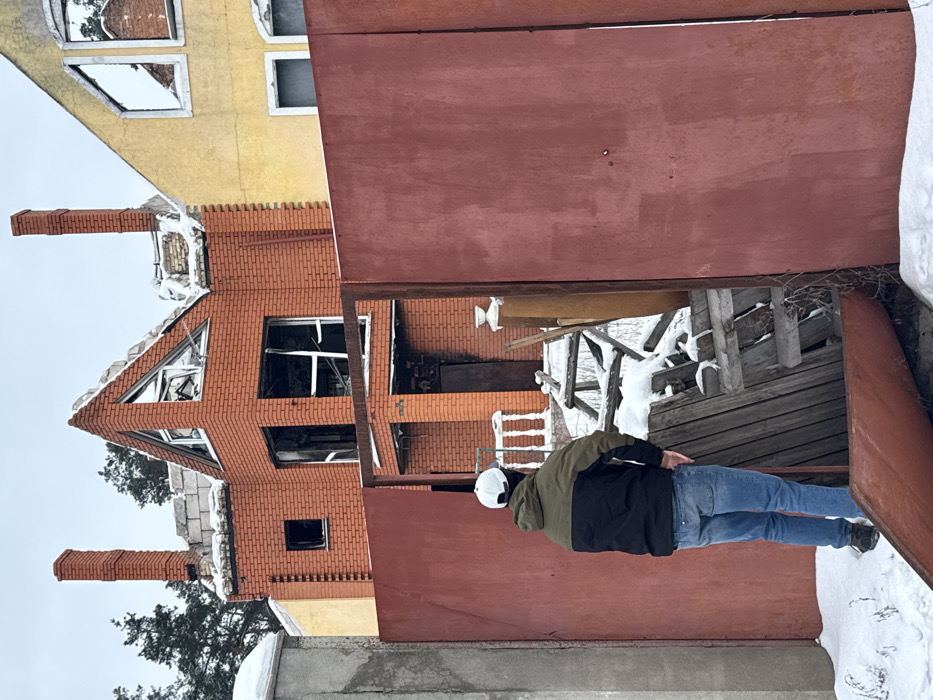The image displays a snow-covered residential scene in Moshchun, Ukraine, under an overcast sky. In the foreground, a large, rusty red metal gate stands partially open, with the left panel retracted inward. A concrete fence post is visible on the far left. A detached, reddish-brown metal panel rests on the snow in the lower foreground, partially obscuring the view into the property. A male individual is positioned within the opening of the gate, facing away from the viewer and towards the damaged structures. He wears a white baseball cap, a dark balaclava, a two-tone jacket (olive green upper, black lower), blue jeans, and dark footwear. Behind the gate, two severely damaged residential buildings are visible amidst snow-covered ground and debris. The primary structure, centrally located, is a two-story house constructed of reddish-brown brick. Its roof is extensively damaged or missing, exposing white structural elements. A prominent brick chimney stands on the left side, while a smaller, damaged chimney is visible on the right. Multiple window openings on both stories are empty of glass, featuring twisted frames. The front entrance area below a small porch with white balusters appears charred and damaged. To the right of the brick house, a second two-story house, painted yellow, is visible. This structure also exhibits damage, particularly to its upper-story windows, which are missing glass and reflect the grey sky. Pine trees are visible in the background behind both houses.