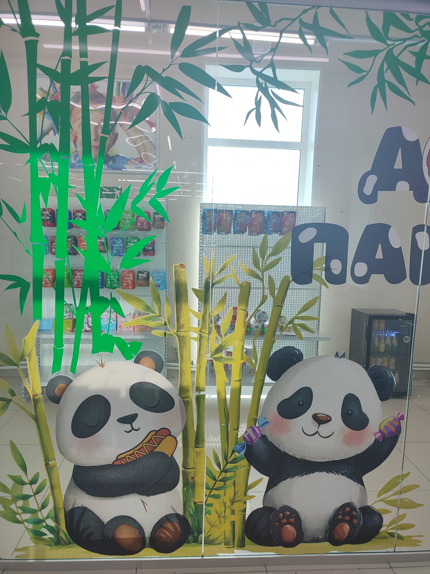 glass window or door with panda-themed decorations. Two cartoon pandas are depicted among stylized bamboo stalks. One panda holds a hot dog, while the other holds candy. Reflected in the glass is a brightly lit interior. Shelves filled with packaged goods are partially visible behind the pandas. A refrigerator containing beverages is visible. The location is likely a store in the city of Chaikovsky, Russia, based on the lettering visible on the window.