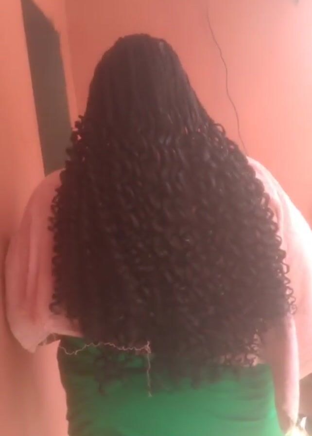 person from the back, standing indoors against a pale orange wall. The person has long, dark, curly hair that extends down past their waist. They are wearing a green shirt and a light pink sweater or wrap. The lighting is slightly uneven, with some areas appearing brighter than others. In the background, there's a glimpse of a window and a white object, possibly a piece of furniture.