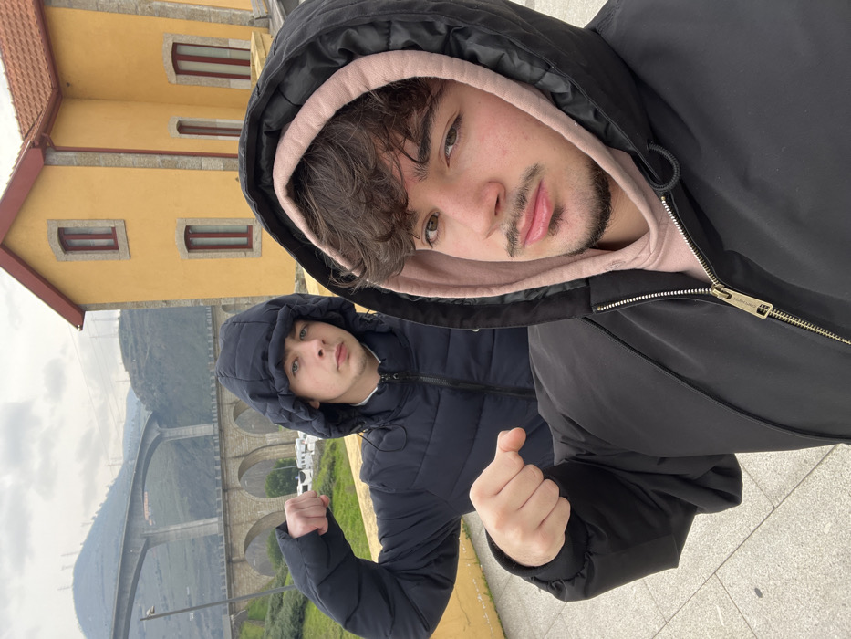 A forward-facing photograph depicts two young adult males outdoors on a paved surface in Peso da Régua, Portugal, under an overcast sky. The subject in the immediate foreground, positioned to the right, has light brown curly hair, a mustache, and a goatee, and wears a black hooded jacket over a pink hooded sweatshirt. He looks directly at the camera with a neutral expression, extending his right arm forward with his index finger pointing towards the lens. Slightly behind and to the left, the second subject, with his hood up on a dark blue puffer jacket, also looks at the camera. He is captured with his right arm bent, flexing his bicep. In the background, a two-story yellow building with multiple red-framed windows and a red tiled roof is visible. Beyond this structure, an old multi-arch stone bridge spans a valley. Above and behind the stone bridge, a modern concrete bridge, likely a viaduct, is prominent. Distant hills covered in vegetation, interspersed with visible power lines and poles, form the horizon. Several white recreational vehicles are parked on a lot situated below the stone bridge.