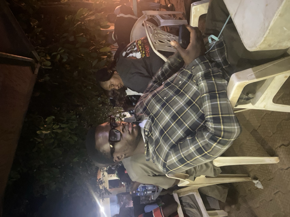 A group of people sit outdoors in white plastic chairs under dim lighting. The foreground shows a man wearing glasses and a plaid shirt, looking to the side. Behind him, another man in a black cap and sweatshirt looks directly at the camera. People are casually dressed, and some have phones in hand. Plants and foliage are visible in the background, suggesting a garden or patio setting. The overall scene implies a relaxed, informal gathering.