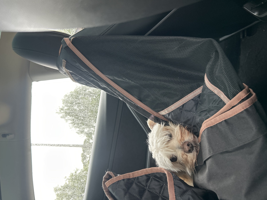 - "Inside a car, a small, fluffy white dog with a tan nose peeks out from a black dog car seat cover with brown trim" by FM-pPdqF3, licensed under CC BY 4.0