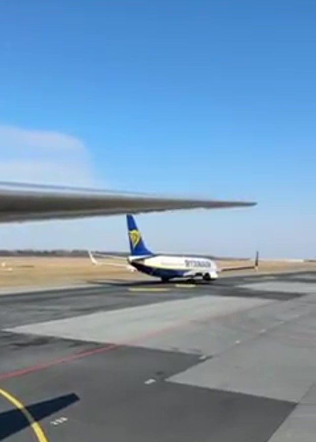 wing of a plane, presumably the one the videographer is on, and another Ryanair plane on the tarmac