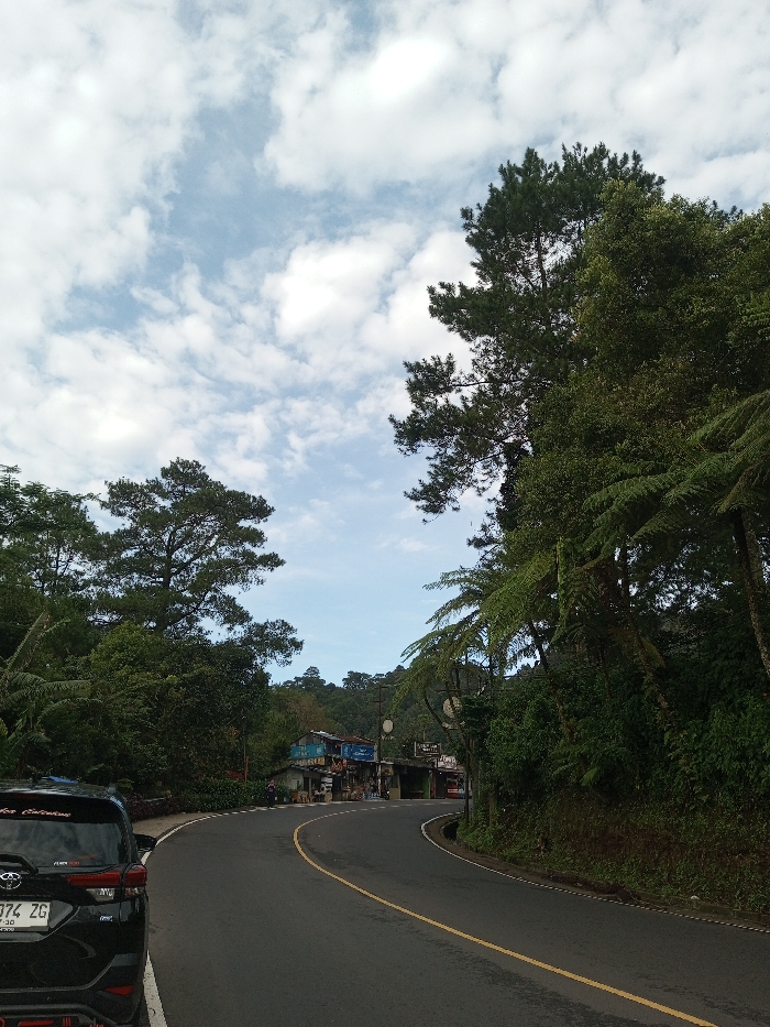 A curved asphalt road with a yellow line snakes through a lush, green landscape. Dense trees and ferns crowd the roadside. In the distance, a small cluster of buildings is visible. A black SUV sits parked on the side of the road. The sky is filled with clouds, with patches of blue sky.