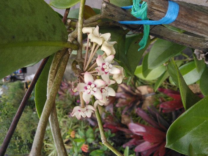 A close-up, vertical photograph depicts a cluster of Hoya flowers in bloom within a garden environment in El Rincón de Monagas, Venezuela. The primary subject is a spherical arrangement of approximately ten to twelve small, star-shaped flowers, each possessing white to pale pink petals and a distinct dark pink or reddish central corona. These flowers are attached to an herbaceous plant characterized by intertwining, light brown stems and dark green, ovate leaves visible throughout the frame. To the right, a weathered wooden stake supports the plant, secured by a bright blue plastic strap and a partially unraveled green plastic strap. The mid-ground features blurred red or burgundy broad-leaved plants, possibly Bromeliads, and a hint of smaller orange-red flowers. The far background shows a blurred paved surface, indicative of a street or sidewalk, occupied by several indistinct human figures, at least one bicycle, and distant green foliage.