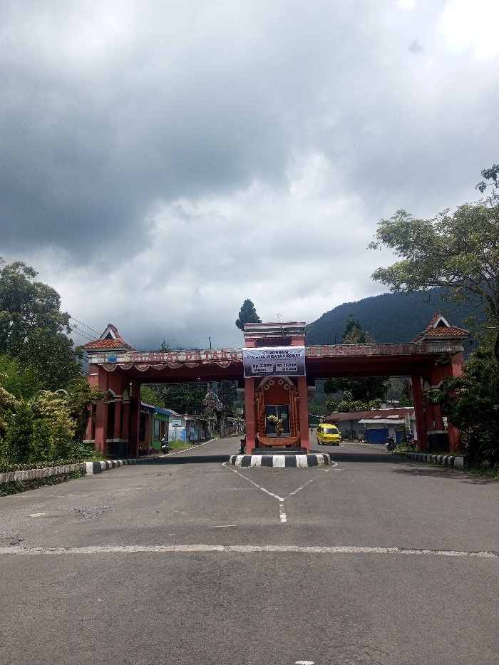 The image displays an asphalt road leading towards a large, ornate reddish-brown archway under a dark, heavily clouded sky. A white banner displayed on the archway identifies the location as "Kawasan Wisata Cibodas" and lists entrance fees in Indonesian Rupiah (RP 7.000 and RP 15.000), contradicting the specified location of Kalchini, India. The archway features traditional architectural elements and a central decorative pillar with a planter. The road in the foreground includes a black and white striped traffic median. Beyond the archway, several small buildings line both sides of the road. A yellow minivan is observed past the archway on the right, and two motorcycles are parked further down the road, one on each side. Dense green mountains are visible in the background beneath the cloudy horizon. No people are present.