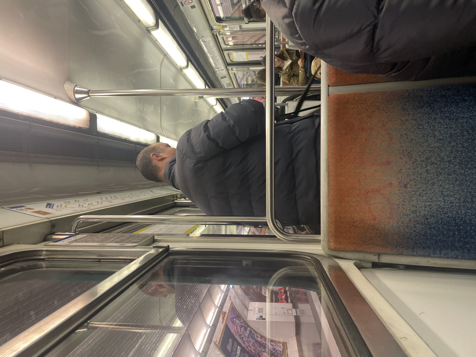 The image depicts the interior of a Paris Métro subway car, likely an older model consistent with Line 12 trains, as indicated by a route map showing "Porte de Versailles" and "Mairie d'Issy" on the ceiling. The train is stopped at or passing an underground station. The station platform is visible as a reflection in the window on the left, displaying arched, tiled walls, two red waiting chairs, a white service booth, and an advertisement poster partially visible with the word "Bitcoin" and a "Métro" sign. In the middle ground, a male individual with short, receding dark hair is seen from the back, wearing a dark puffer jacket, looking downwards. In the immediate foreground to the right, the shoulder of another passenger in a dark puffer jacket is visible. The train's seating is upholstered in a worn, textured fabric fading from orange-red at the top to blue-gray at the bottom. Silver-colored vertical and horizontal grab rails are prominent. Several other passengers are visible further inside the car, including a female in a light brown jacket seated and looking at a mobile device. The train car is illuminated by bright overhead fluorescent lights. No direct interactions between individuals are observed.