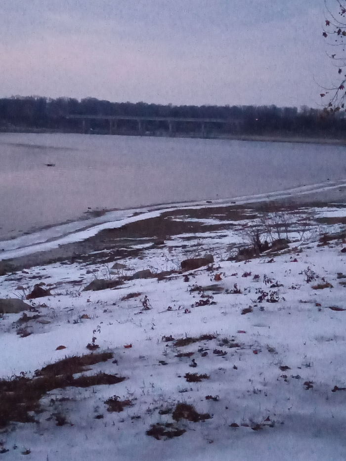 A landscape photograph shows a body of water with a bridge in the background, captured on a cloudy day. The foreground is covered in snow with patches of ground and vegetation peeking through. The shoreline is visible with a strip of ice. The overall mood is serene and cold.