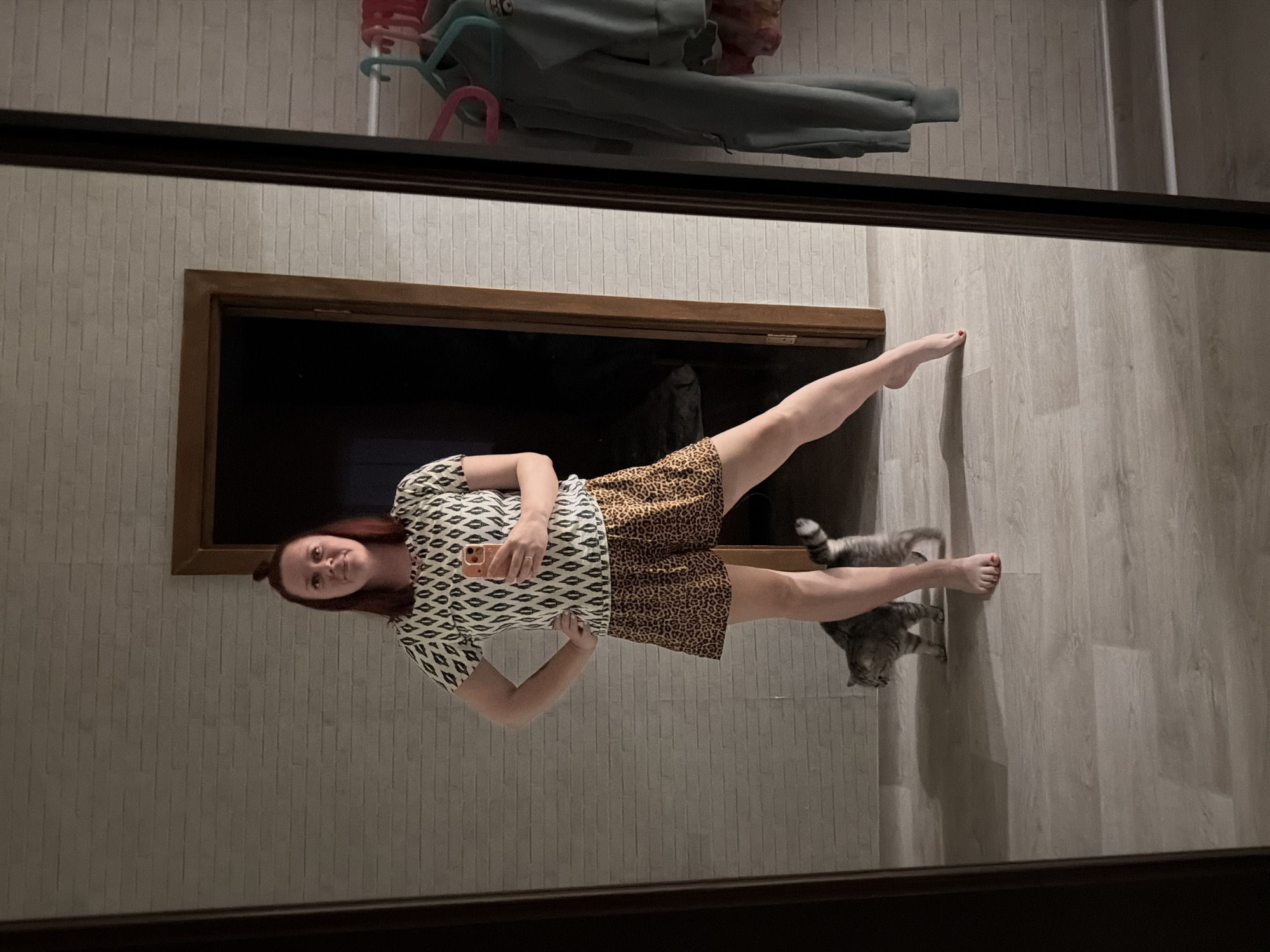 A woman in a patterned top and leopard print skirt is reflected in a mirror. Her right leg is extended straight up. A gray tabby cat is near her feet. The background shows a wall, a door, and clothes hanging. The location is Chaikovsky, Russia.