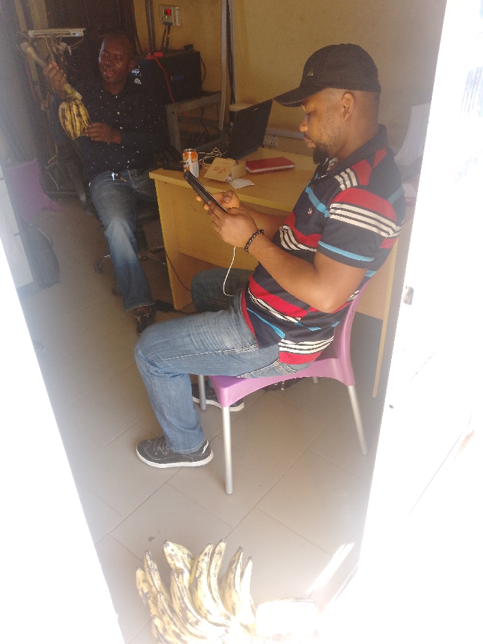 The image depicts an indoor scene in Sabon Tasha, Nigeria, featuring two adult males within what appears to be an office or common area