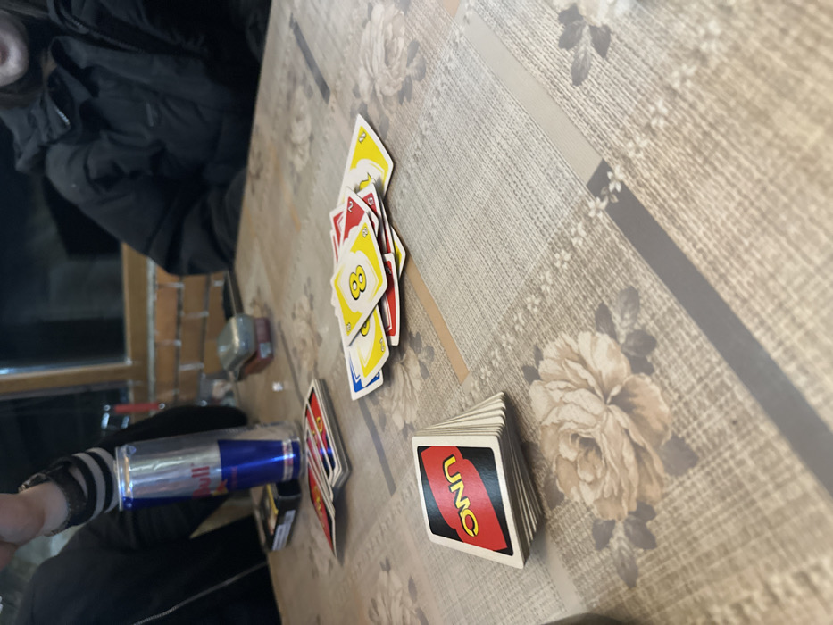 This image depicts an indoor scene in the city of Taran, Bulgaria, with a focus on a table where individuals are playing UNO
