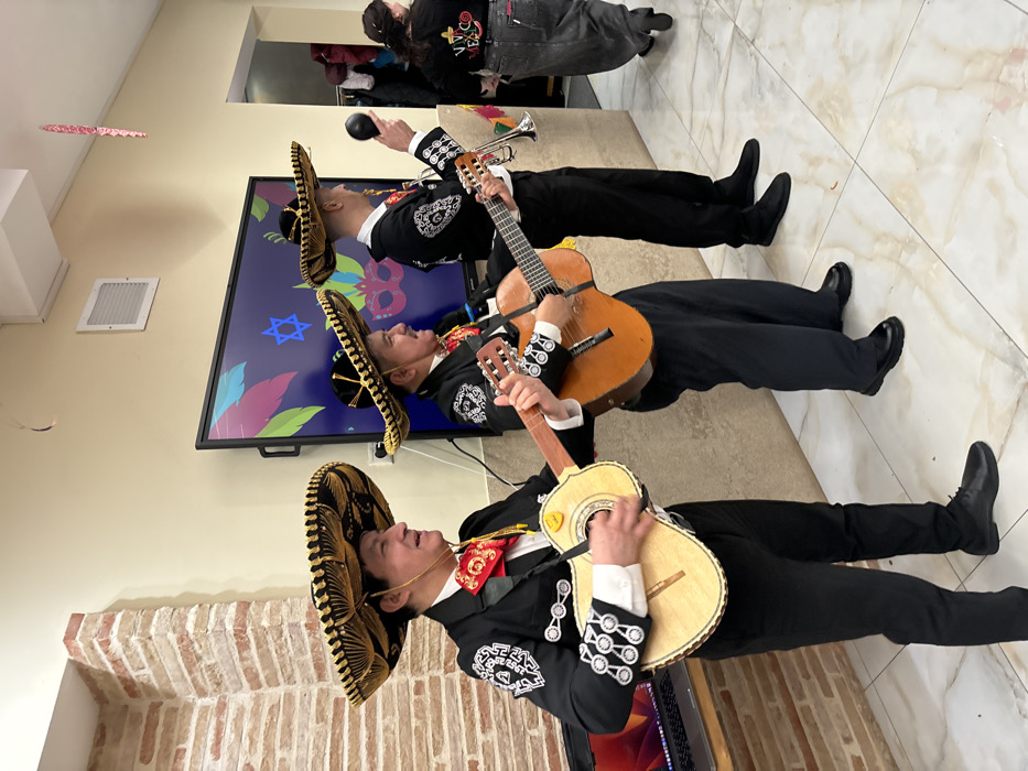 The image depicts an indoor event in Moscow, Russia, featuring three male Mariachi musicians. Each individual is uniformly attired in a black *charro* suit featuring white embroidery, a white dress shirt, a red bow tie, and a large black *sombrero* with gold trim. The musician positioned on the far left holds and appears to play a light-colored acoustic guitar, with a slight smile on his face. The central musician, identifiable by a mustache, holds and appears to play a classical acoustic guitar. The musician on the right holds a black maraca in his right hand and a silver trumpet in his left. All three are standing upright. The background includes a large, black flat-screen monitor displaying multicolored graphics: stylized masquerade masks, vibrant feather patterns, and a prominent blue Star of David. To the left of the musicians, a silver laptop with an illuminated red screen is visible on a surface. Several pink, curled paper streamers hang from the ceiling in the upper right. The immediate environment features light-colored walls, with a decorative section of light-brown brickwork on the left. The floor consists of polished, light-toned tiles with a subtle veined or marble pattern. In the far right background, a fourth individual, wearing a black shirt with "VIVA MEXICO" printed in white on the back and dark lower garments, is partially visible walking away towards an open doorway.