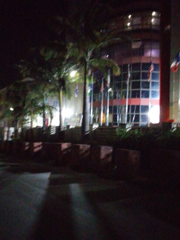 A dimly lit outdoor scene at night showcases a modern building with a glass facade and horizontal red accents. Several flags are displayed in front of the building. Trees, including palm trees, obscure the view of the building. A low wall of structures runs along the front, with dark pavement in the foreground, and shadows from unseen light sources are cast on the ground.