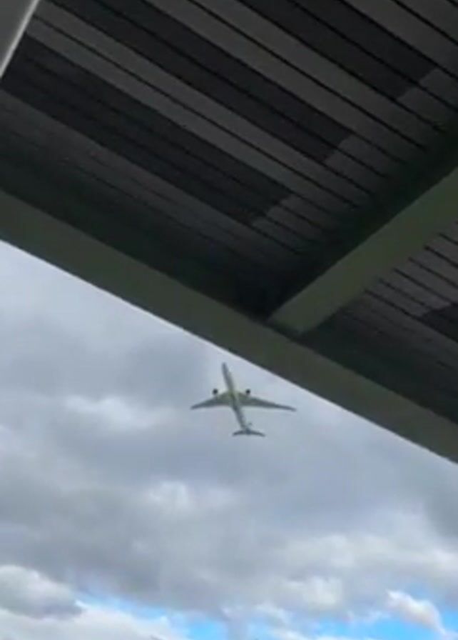 white airplane flying overhead, captured from under a sheltered structure with a dark gray, slatted ceiling. The sky visible beyond the shelter is filled with clouds. A glimpse of green vegetation and part of a white truck are visible in the lower left corner of the frame. The camera follows the plane as it passes directly above.