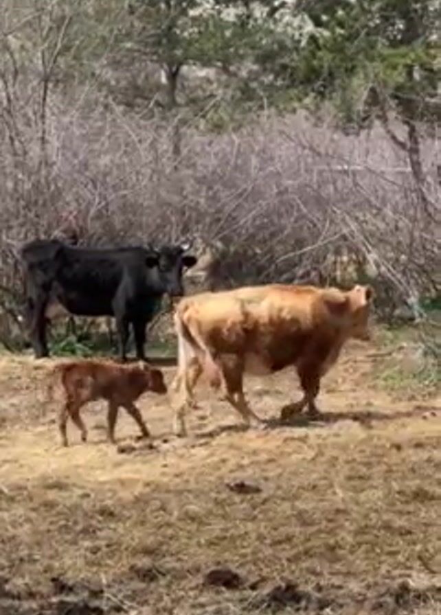 three cows, one black, one light brown, and a small reddish-brown calf in a grassy field. The brown cow and the calf are walking toward some leafless bushes. The black cow stands still in the background. The environment includes trees and dry grass.
