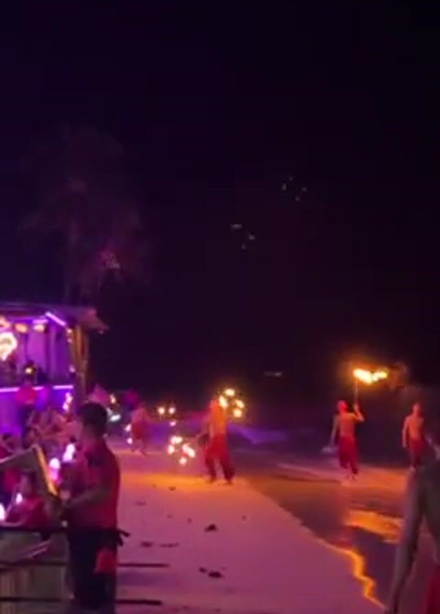 At night, on a beach, several shirtless men in red pants walk along the water's edge carrying torches. The sand is lit with colored lights, and there is a bar or restaurant with glowing lights on the left. Some people are milling about the restaurant area. One man is standing holding a torch, and swings it. One man appears to be tattooed on his back. The sky is dark.