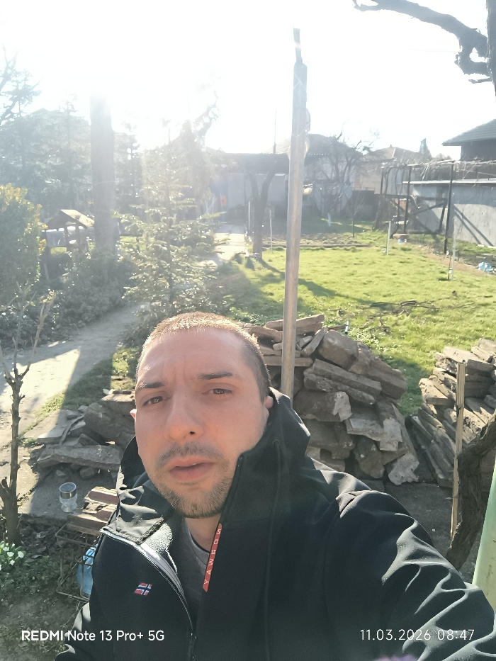 A male individual is captured in a selfie-style photograph outdoors in Dolni Dabnik, Bulgaria, on March 11, 2026, at 08:47