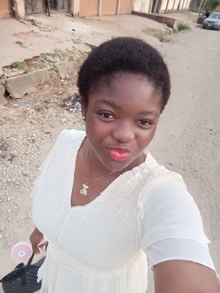 A young woman with short, dark hair and dark skin takes a selfie outdoors. She is wearing a white dress and a gold necklace with a teddy bear pendant. She has red lipstick and is making a kissy face. In her left hand, she holds a small pink fan. Behind her is a street with buildings and a car in the background. The ground is cracked and uneven with some debris.