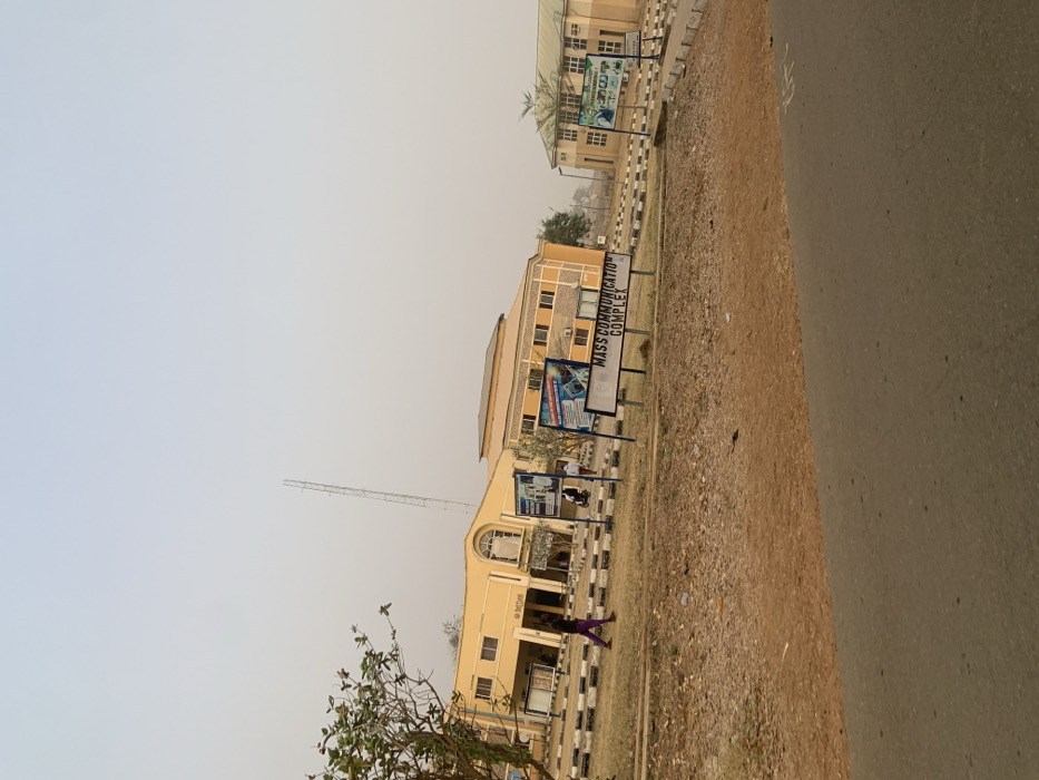 A hazy daylight scene displays a beige, multi-story building marked "MASS COMMUNICATION COMPLEX" with prominent signage. A tall radio tower rises behind it. To the right, a tan grassy area meets an asphalt road. Another similar beige building stands further back. A pedestrian walks along a striped curb. The sky is a muted, overcast color.
