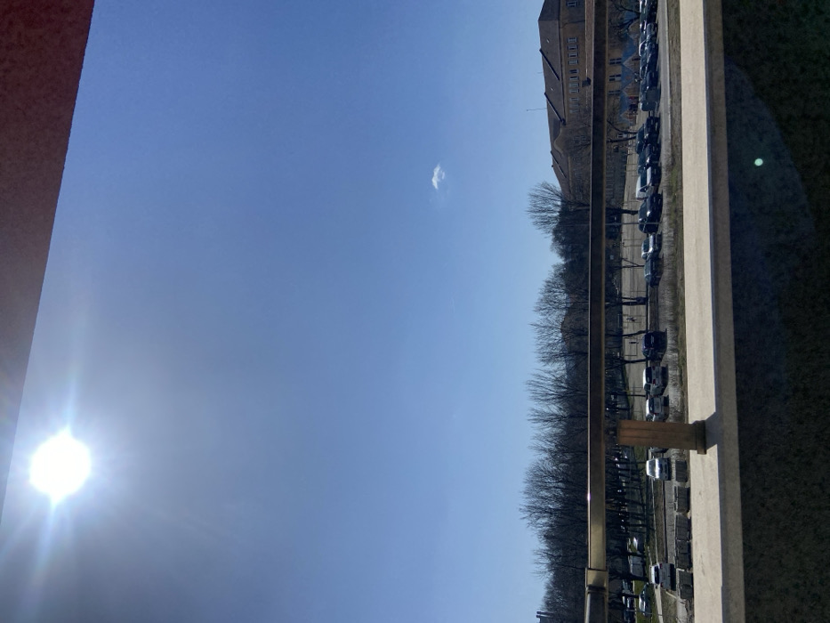 The scene depicts an outdoor urban environment in Pernik, Bulgaria, under a clear, bright blue sky with a prominent sun in the upper-left quadrant casting significant lens flare. A single, small white cloud is visible in the upper-mid sky. The image is captured from an elevated perspective, looking over a light-colored concrete or stone ledge and a horizontal, reflective golden-brown metal railing in the mid-ground. Beyond the railing, a dense line of leafless deciduous trees forms a barrier across the middle of the frame, indicating late winter or early spring. Behind these trees, a parking area contains numerous parked passenger vehicles, including cars and vans, visible as dark shapes against the lighter ground. Further beyond the parking area, to the right, a large, multi-story building with a light brown facade and a dark sloped roof is visible, featuring multiple rectangular windows. In the center-left, behind the trees and parking lot, an open area resembling a sports field or playground is discernible. No clearly identifiable individuals or specific actions are visible within the frame.