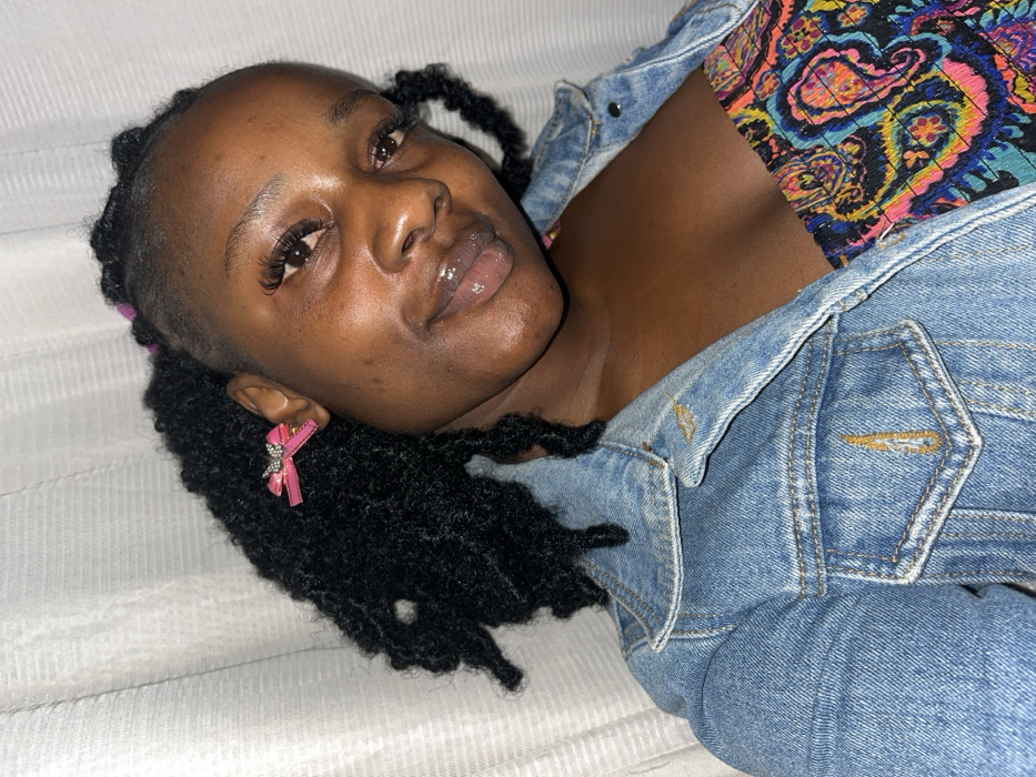 A dark-skinned woman is lying on a light-colored surface, looking directly at the camera with a slight smile. She wears a denim jacket over a colorful patterned top. Her hair is styled in twists, and she has pink ribbon-shaped earrings. Her skin has a glossy appearance, particularly her lips.