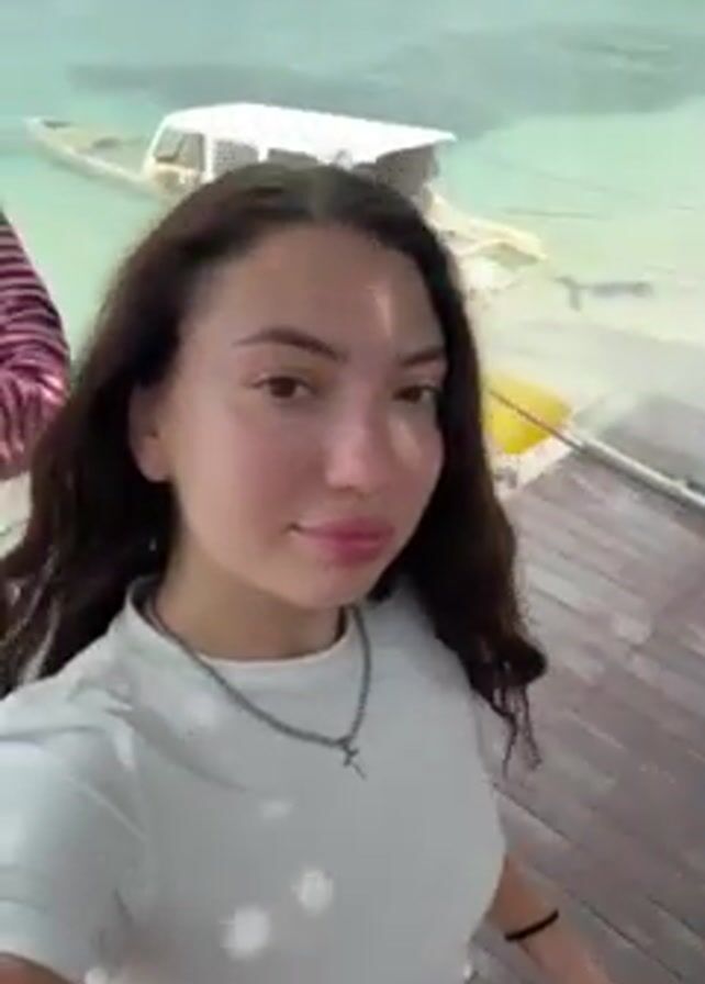 A woman wearing a white t-shirt and a silver necklace with a cross pendant is holding the camera and filming a video of herself on a wooden deck. Behind her, another person wearing a red and white striped shirt is holding a phone. The background shows a tropical beach with clear, turquoise water and several boats anchored. The woman holding the camera is looking directly at the camera with a neutral expression, while the other person is briefly visible in the background before stepping out of the frame.