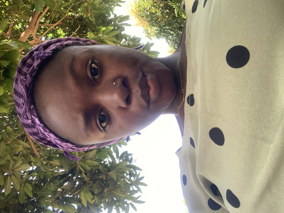 An individual is depicted in a close-up, low-angle shot, looking directly at the camera. The person has dark skin, wears a purple patterned headscarf with visible fringe, and a light-colored (possibly light green or beige) top with large black polka dots. A small silver-colored nose stud is present on the left nostril, and a thin gold-colored chain necklace is visible around the neck. The background features green tree foliage under a bright sky, indicating an outdoor environment in daylight. The scene is located in Arawa, Nigeria.