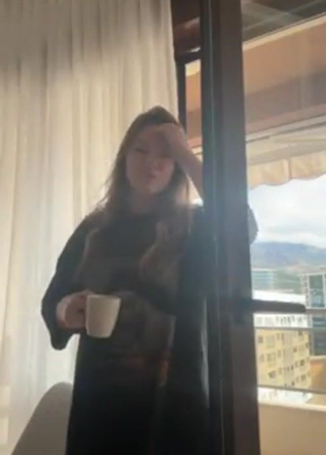 A fair-skinned young woman stands by an open doorway in front of sheer white curtains, holding a white mug and wearing a black oversized t-shirt with an image on the front. She drinks from the mug, looking into the camera. Outside the doorway is a balcony with a partial view of a city landscape with a mountain in the background. The frame is primarily lit by daylight.