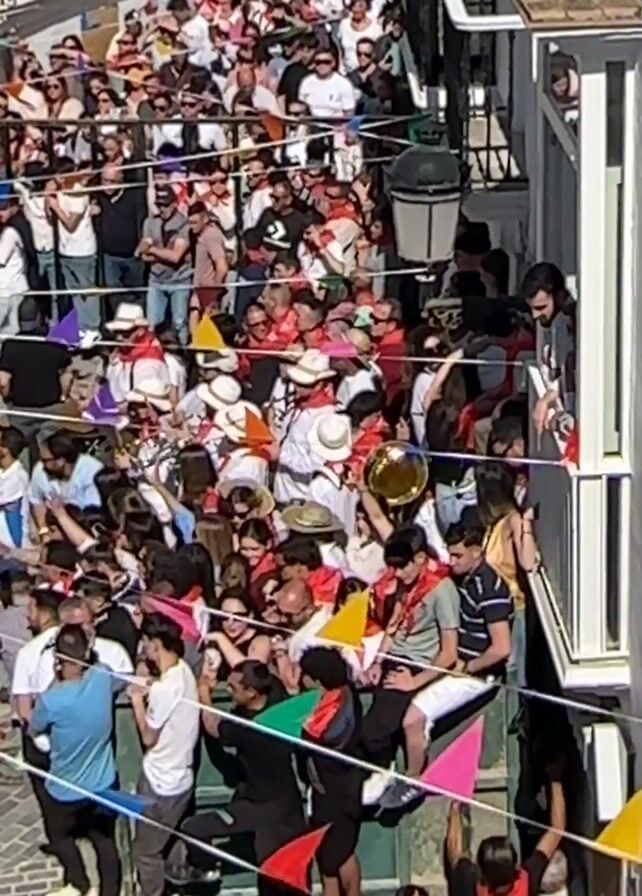 blurry, high-angle shot of a large crowd of people densely packed in a street. Many individuals are wearing white shirts or tops, creating a visually dominant element in the crowd. The street is adorned with festive decorations, including strings of colorful triangular flags hanging overhead. The buildings lining the street appear to be light in color. The overall atmosphere suggests a public event or celebration taking place.