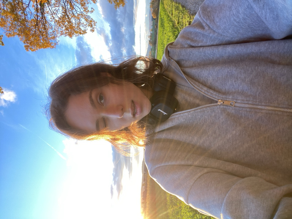 An outdoor selfie captures a young woman, appearing to be in her late teens or early twenties, winking with her left eye and a slightly open mouth. She has medium-length, wavy, reddish-brown hair, strongly backlit by the low sun positioned in the upper left of the frame. She wears a light gray zippered hooded sweatshirt, partially zipped, and black Marshall over-ear headphones around her neck. The background features a rural landscape under a blue sky with scattered clouds and visible contrails. To the left is a vibrant green field, and to the right, an unpaved path or dirt road. Distant hills are visible on the horizon. In the upper right quadrant, the bare branches of a tree display some remaining yellow-orange autumn leaves. The scene depicts a late afternoon or sunset in Glattbrugg, Switzerland.