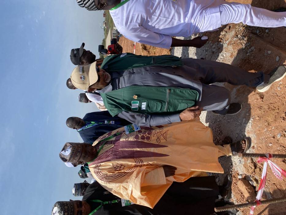 A group of approximately six to eight men is depicted walking outdoors on an uneven, reddish-brown dirt and gravel surface in Gwagwada, Nigeria, under a clear, bright sky. In the foreground, exposed rebar wrapped with red and white striped caution tape marks the edge of a disturbed ground area. The central figure on the left is a man dressed in a flowing, light orange traditional agbada with intricate dark red embroidery on the chest, wearing a patterned cap and sandals. An identification badge is visible around his neck. To his right, another prominent figure wears a grey long-sleeved shirt and trousers, topped with a dark green utility vest featuring a Nigerian flag patch and "NMA" text on the left chest. He wears a light tan baseball cap with "FMAES" and an emblem, along with dark sneakers and an identification badge. Other individuals in the group wear varying attire, including dark suits, white traditional garments, and various caps. One individual in the background holds a red-bodied camera. The men appear to be walking in procession or during an inspection. In the far background, light-colored buildings and industrial structures are visible on the horizon.