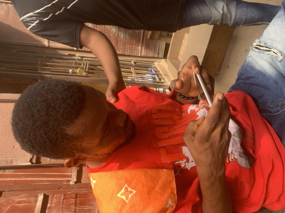 The image depicts two dark-skinned males in an outdoor urban setting within Fegge, Nigeria