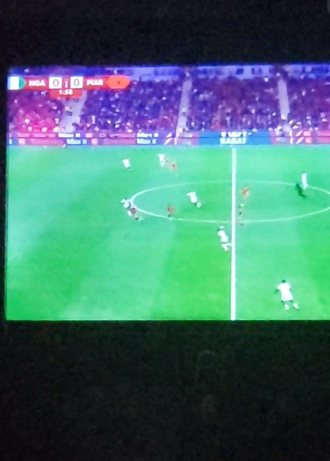 A vertical video shows a soccer game being played on a green field. On the left of the screen is the left third of the television, including the scoreboard. The stadium has a crowd in the background. Players run across the field.