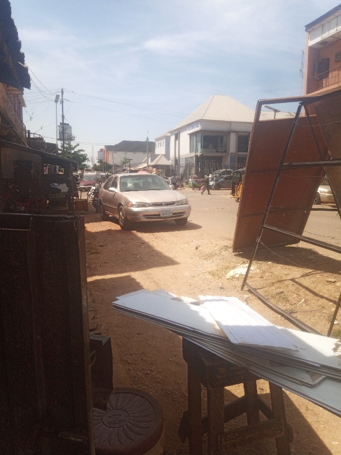 This image depicts an outdoor street scene under direct sunlight in an urban setting within the city of Unknown, Unknown. The foreground consists of a reddish-brown dirt surface. On the left, a dark-colored stool with a carved circular design is partially visible near a dark structure. Adjacent to it, a stack of light-colored, rectangular panels rests on a wooden stand. To the right, a large, dark metal A-frame structure stands on the dirt. In the midground, a light-beige four-door sedan (consistent with an early 2000s Toyota Corolla) is parked on the dirt shoulder, facing away from the viewer. Further along the road, which appears to be paved, pedestrians are visible, including one individual walking away from the camera. Other vehicles, such as motorcycles, cars, and a yellow three-wheeled vehicle, are present. On the right, a multi-story commercial building with large glass windows and a light-colored sloped roof, displaying a partial sign for "PALACE HOTEL," stands prominently. Utility poles with overhead power lines are visible throughout the scene. The sky is clear blue, and strong shadows indicate bright overhead sunlight.
