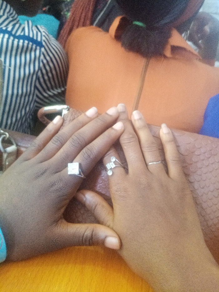 This image depicts a close-up view of two hands, belonging to two individuals, positioned side-by-side on a textured brown surface. The hand on the left, with a darker complexion, wears a silver-colored ring featuring a large, square, faceted clear stone on the ring finger. A light blue wristband is visible on its wrist. The hand on the right, with a slightly lighter complexion, wears two silver-colored rings: one with a cluster of four clear stones on the ring finger, and a plain, thin band on the middle finger. Fingernails on both hands are natural and unpolished. The brown surface, likely a handbag or briefcase, extends beneath the hands. In the background, partially visible elements include a striped garment (white with blue vertical stripes) to the upper left, an orange-brown fabric surface with a dark hair tie secured by a green band in the upper center, and a blue fabric detail to the far right. The immediate foreground shows a smooth, yellow-orange surface. The scene is located in the city of Dabawa, Nigeria.