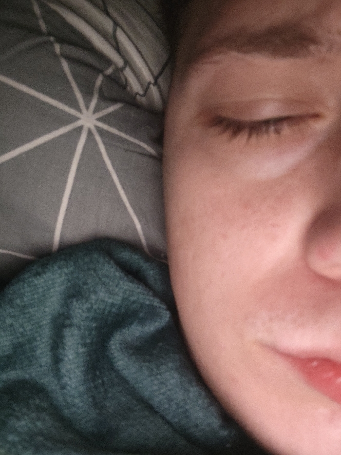 A close-up, high-angle image depicts the right side of a human face. The individual's right eye is closed, with visible eyelashes. The skin exhibits a light tone, with minor surface variations visible on the cheek and around the lower lip. A small portion of the lower lip is visible at the bottom right. The head rests on a grey pillow adorned with a white geometric starburst or radial pattern. A dark teal or deep green textured fabric, possibly a blanket or article of clothing, is visible below the face, partially covering the lower left of the frame. The lighting is diffused. The environment is consistent with an indoor setting. The image does not contain visual information to determine its specific location within Vratsa, Bulgaria, or any particular city.