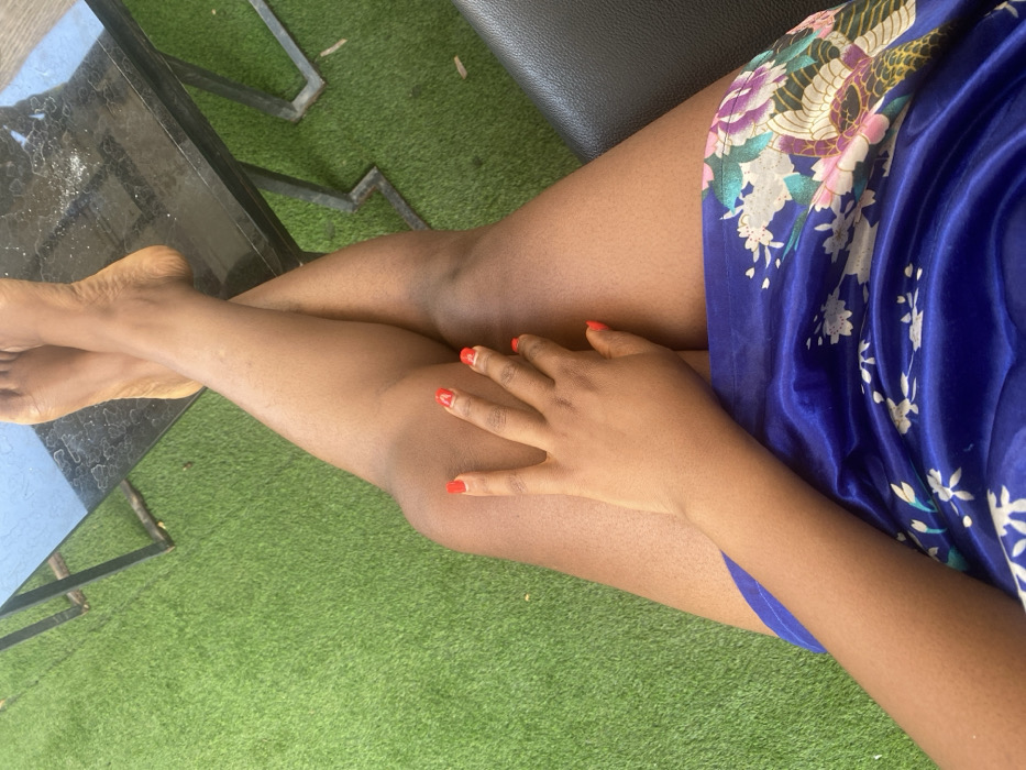 The image depicts a first-person, downward view of a seated individual. The person's dark-skinned legs are crossed at the knees, with the right leg positioned over the left. Bare feet rest on the surface of a black, glass-topped table, which is marked with white residue. The left hand, displaying red nail polish on the fingernails (some chipped), rests on the left thigh. The individual wears a blue, satin-like garment featuring a multicolored floral and crane-like bird pattern on the right side. The ground surface is covered with green artificial turf. A black object, consistent with a chair armrest, is partially visible along the right edge of the frame. The specific location within Galadimawa, Nigeria, cannot be determined from the visual information provided in the image.
