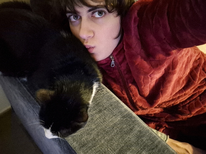 - "A person in a reddish-purple fuzzy jacket pouts at the camera, their face close to a black and white cat lying on their lap" by FM-O7Vkg2, licensed under CC BY 4.0