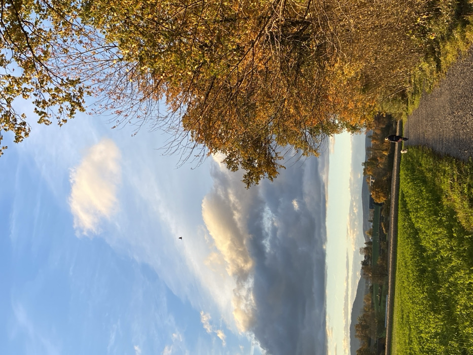 This image captures an autumnal landscape near Glattbrugg, Switzerland, during late afternoon. A single individual, dressed in dark clothing, walks away from the viewer on a gravel path that extends from the lower-center foreground into the midground. A small, white, short-haired dog walks off-leash approximately one meter in front of the person on the path. To the immediate left of the path is a cultivated green field, beyond which lies a strip of lighter, possibly dormant, vegetation. A dense line of deciduous trees displaying golden-yellow and orange autumn foliage borders the path on the right side, brightly illuminated by a low-angle sun. In the background, rolling hills with scattered buildings and distant vegetation are visible. The sky features a mix of clear blue, streaky cirrus clouds, and larger, partially sunlit cumulus clouds. A single dark bird is in flight in the upper-middle portion of the sky.