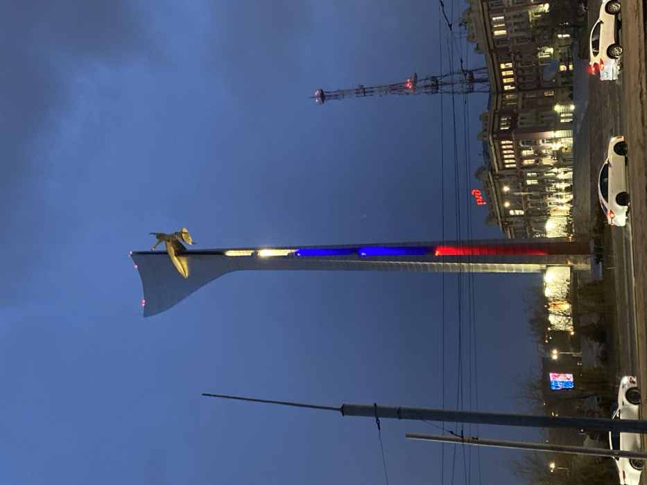 The image depicts the Stele "City of Military Glory" located at the intersection of Bolshaya Sadovaya Street and Voroshilovsky Avenue in Rostov-on-Don, Russia, during dusk or early night. The prominent central subject is a tall, slender stele with a metallic or light-colored finish. Its main shaft is vertically illuminated with three distinct light strips: white on the left, blue in the middle, and red on the right, mirroring the colors of the Russian flag. At the apex of the stele, a golden, winged sculptural figure holding what appears to be a wreath is prominently displayed. In the background to the right, a large, ornate multi-story building with numerous illuminated windows is visible. A red neon sign displaying the Cyrillic letters "РЖД" (RZhD, or Russian Railways) is mounted on the building's roofline. Further to the right, a tall, lattice-style communication tower equipped with multiple red warning lights ascends into the dark blue, cloudy sky. In the foreground, a multi-lane road is present. Three white passenger vehicles are on this road: two sedans are visible on the left, seemingly stationary, and one white SUV with illuminated red taillights is positioned on the right, indicating movement away from the viewer. A tall, thin utility pole with overhead wires is visible on the far left of the frame. The overall environment is an urban setting under artificial illumination. No individuals are discernible.