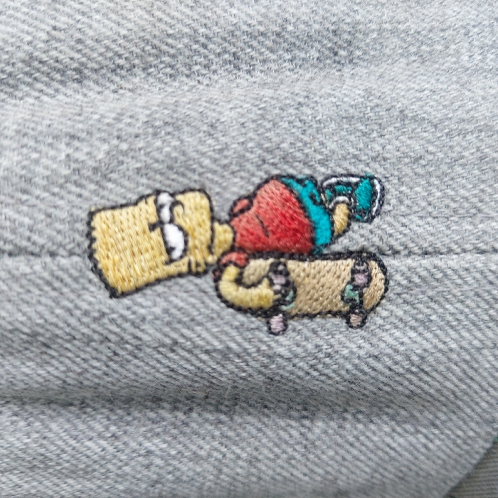 A close-up photograph displays an embroidered depiction of the animated character Bart Simpson on a grey twill fabric