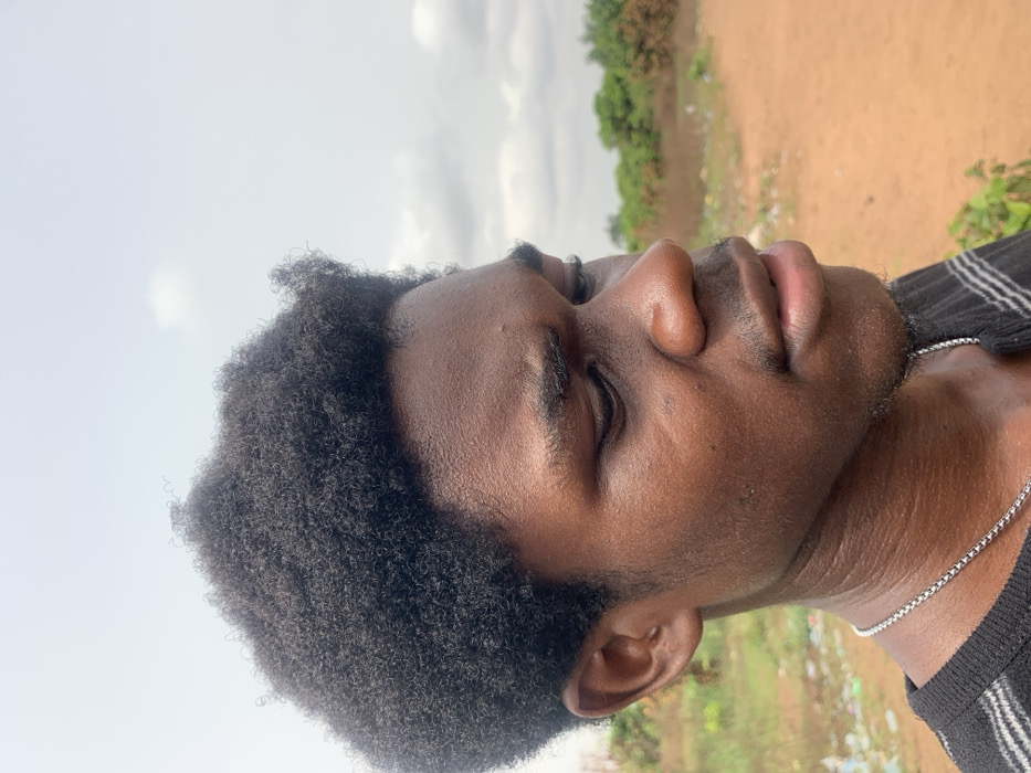 A close-up, profile portrait depicts a young Black male in an outdoor environment within Ihiagwa, Nigeria