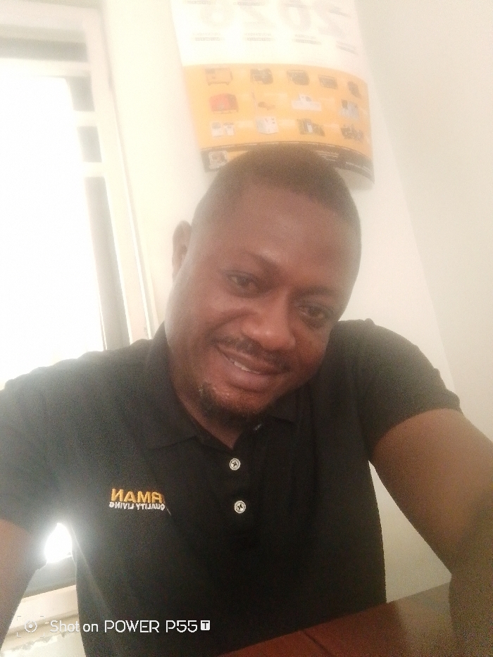An adult male, likely of African descent, is depicted in an indoor selfie, smiling and looking directly at the camera