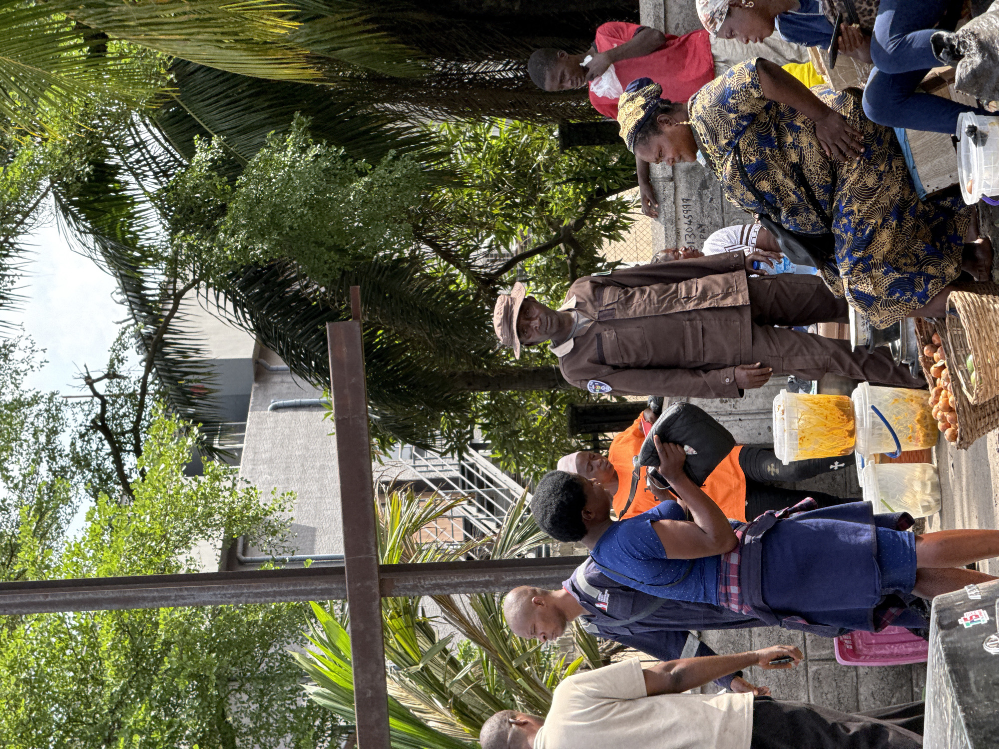 The image depicts an outdoor, daylight scene in the city of Ilado, Nigeria, featuring multiple individuals and market items. Approximately ten people are visible. In the left foreground, a man in a tan shirt holds a dark object. To his right, a bald man in a dark blue uniform with a "LAGOS STATE" patch on his left arm and a dark shoulder bag looks to the right. Centrally, a woman in a blue top and skirt with a plaid fabric at her waist holds a black bag open, looking into it. Behind her, a person in a bright orange shirt and dark pants is partially visible. Standing centrally, a man in a brown uniform and a wide-brimmed hat faces forward. To his right, a young male in a red t-shirt stands against a low concrete wall, holding a white plastic item to his face. Further right and seated on a low platform, a woman in a blue and yellow patterned dress and headscarf wears gold earrings and looks right. Adjacent to her, a woman in a light headscarf and dark blue clothing is seated, holding a dark object. Numerous clear plastic buckets containing a yellowish-orange substance are on the ground, some stacked. A woven basket filled with reddish-brown, round fruits (possibly garden eggs) sits on the ground, alongside another basket of green leafy vegetables. A pink plastic basin is visible in the left-midground. A black bag is held by the woman in blue, and another is slung over the shoulder of the seated woman in the patterned dress. A large, rusty metal cross-beam structure is prominent in the upper left of the frame. The concrete wall in the mid-ground has the number "513045999" inscribed on it. The environment includes lush green foliage, with trees and palm fronds prominent in the background and right side. A light-colored building with external piping and a metal staircase is partially visible behind the individuals. The sky is bright. The ground surface appears to be unpaved or worn concrete.