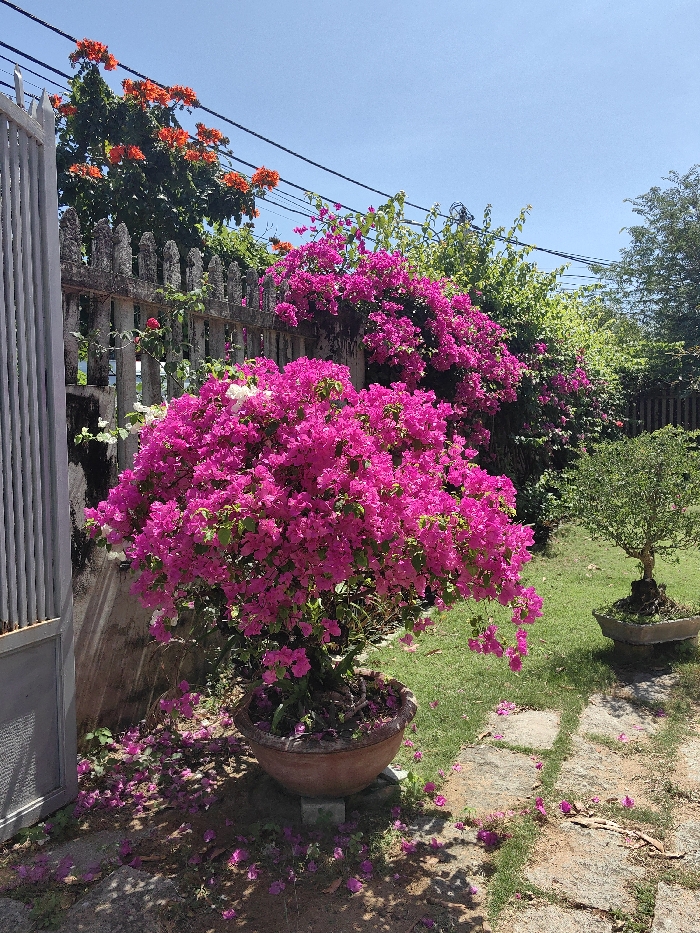 The scene depicts a vibrant outdoor garden environment under a clear blue sky in Tuy Hòa, Vietnam. A large bougainvillea plant with prolific fuchsia-colored blooms occupies the left midground, potted in a round terracotta-colored container resting on a small concrete block. Numerous detached fuchsia petals are scattered on the bare ground and stone path directly beneath and around the potted plant. To the immediate left, a portion of an open grey metal gate with vertical slats is visible, casting a shadow. Behind the main bougainvillea, a weathered grey concrete fence with arched-top pickets extends horizontally across the midground, partially obscured by dense green foliage and more fuchsia bougainvillea. Above and behind the fence, a tree displaying clusters of bright orange flowers is prominent against the sky. Several black power lines traverse the upper portion of the frame horizontally. The ground consists of well-maintained green grass interspersed with an irregular flagstone path leading towards the right. In the right midground, a smaller, dark green bonsai-style tree is visible in a light grey rectangular pot on the grass. The overall lighting suggests strong sunlight, with shadows visible on the ground. No people or active interactions are present in the image.