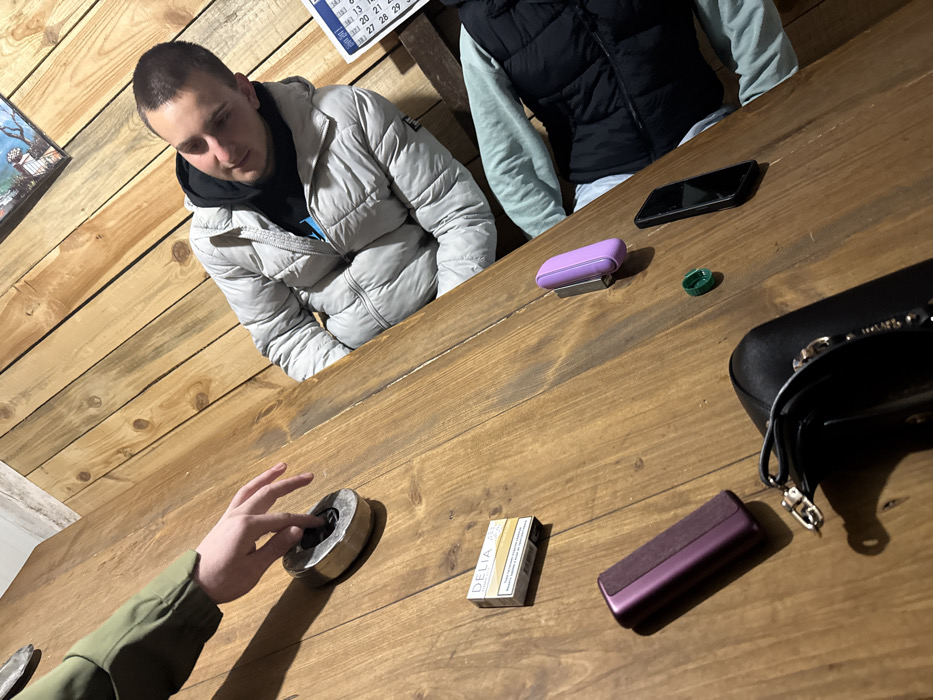 The scene is set indoors in Atiya, Bulgaria, at a light brown wooden table, with a wall composed of horizontal wooden planks in the background. Three individuals are present. In the left foreground, a person's arm, clad in an olive green long-sleeved garment, extends a hand towards a circular metallic ashtray containing dark residue. A "DELIA KING SIZE" cigarette pack is positioned near the ashtray. Further right on the table are a dark purple rectangular electronic device, a light purple oval electronic device, a small green plastic ring, a black smartphone placed face down, and a partially visible black handbag with a metallic chain. Seated at the table to the right is a male with short, dark hair, wearing a black hooded sweatshirt under a light grey puffer jacket, looking towards the left side of the table. A third individual is partially visible to the right, wearing a light blue long-sleeved shirt under a dark sleeveless puffer vest. A framed picture and a calendar are affixed to the wooden wall.