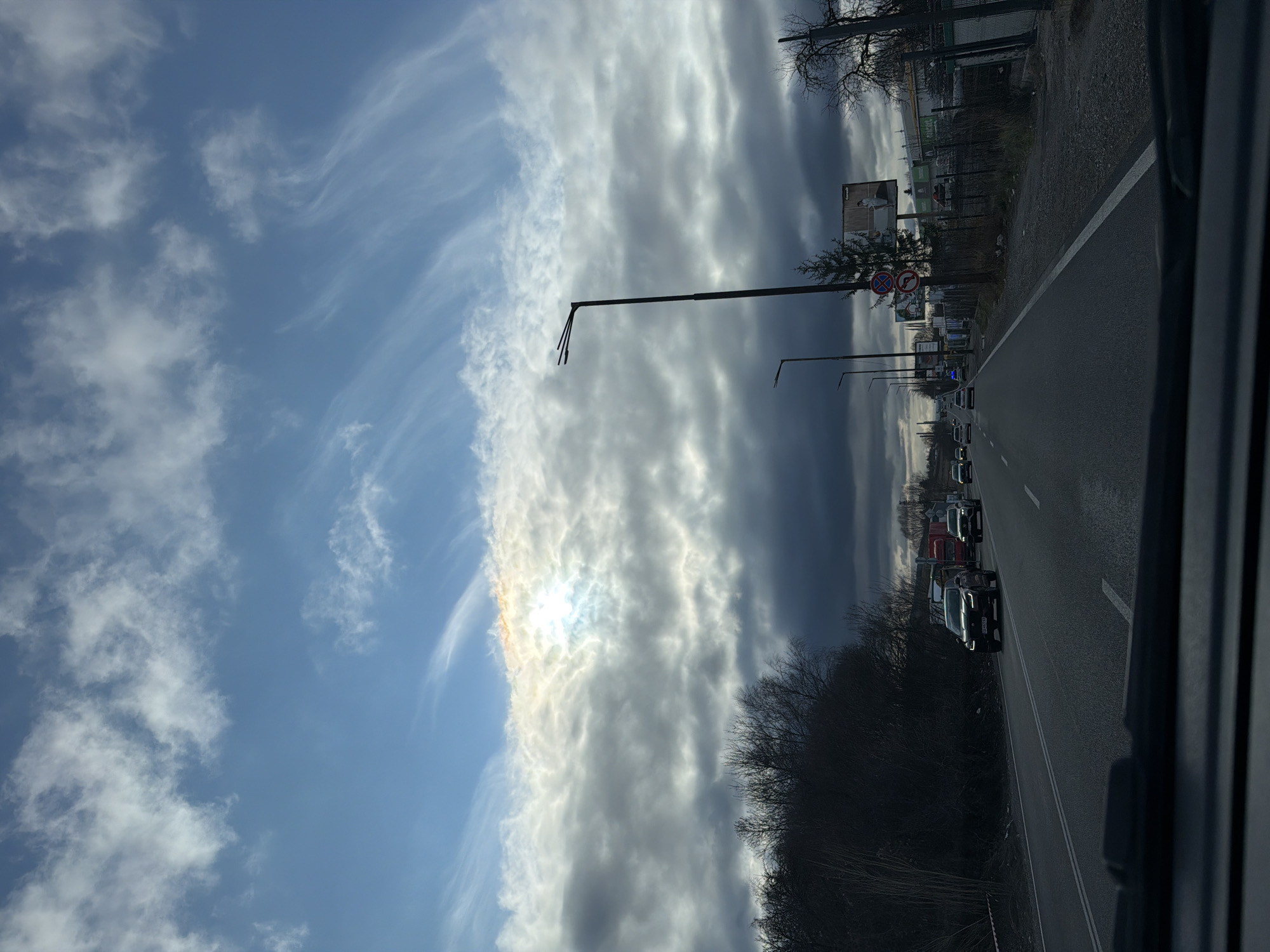 The image depicts a daytime road scene in Dragichevo, Bulgaria, viewed from inside a vehicle through its windshield. The sky is partially obscured by dense cloud layers; a bright sun with a slight iridescent halo is visible through an upper band of white and grey clouds, while darker, heavy clouds dominate the lower sky on the left. Patches of blue sky with wispy white clouds are visible at the top. On the left side of the road, a dense line of bare deciduous trees and bushes runs alongside, with white and red barrier tape visible at its base. The road itself is asphalt, featuring a double solid white line separating traffic moving in opposite directions in the foreground. On the right side of the road, a dirt verge borders the tarmac. Several dark streetlights with triple-armed fixtures extend upwards and recede into the distance. A tall, conical evergreen tree stands near the foreground streetlight. Further along, a wire fence separates the road from industrial or commercial buildings, one of which displays a "praktiker" logo. Two circular road signs are present on a pole: a "No Entry" (red circle with white bar) and a "No Left Turn" (blue circle with crossed-out left arrow). A billboard for "Cornelli" featuring a person in a white towel is visible above the fence line. Vehicles are present on the road. In the opposing lane (left), a dark-colored SUV with illuminated headlights (Bulgarian license plate "CB 0077") is visible in the mid-ground, followed by a red semi-truck with a white trailer, and another lighter-colored SUV further back. In the lane moving away from the observer (right), multiple vehicles are visible in the distance, including cars and a possible emergency vehicle with blue flashing lights. No pedestrians are visible in the immediate foreground or mid-ground. The lower portion of the image shows the dashboard or windshield frame of the observer's vehicle.