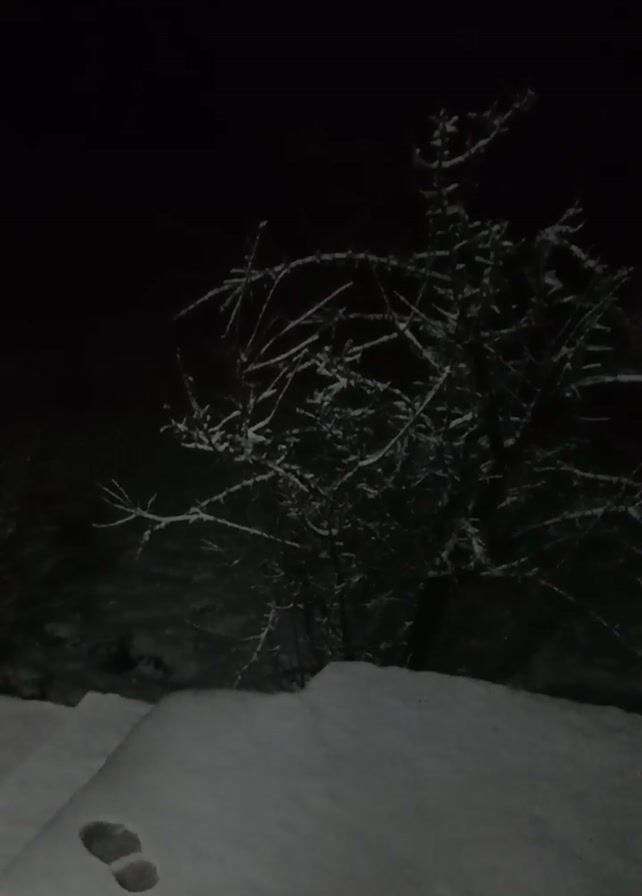 The video depicts a dark, snowy night. A snow-covered wall or structure is visible on the right side of the frame, with visible footprints in the snow. To the left, a dark, bare bush or small tree is present. The background is black, implying a lack of lighting beyond the snow. A faint light is visible in the upper left corner of the frame. The camera angle is low, pointing upwards.