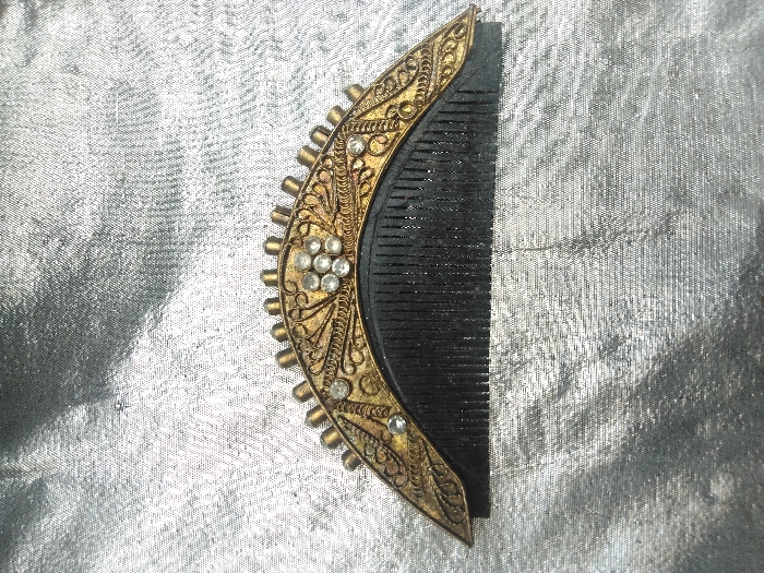 - "An ornate vintage hair comb is centrally depicted against a silver-grey, reflective, crinkled fabric background" by FM-9dzTh2, licensed under CC BY 4.0